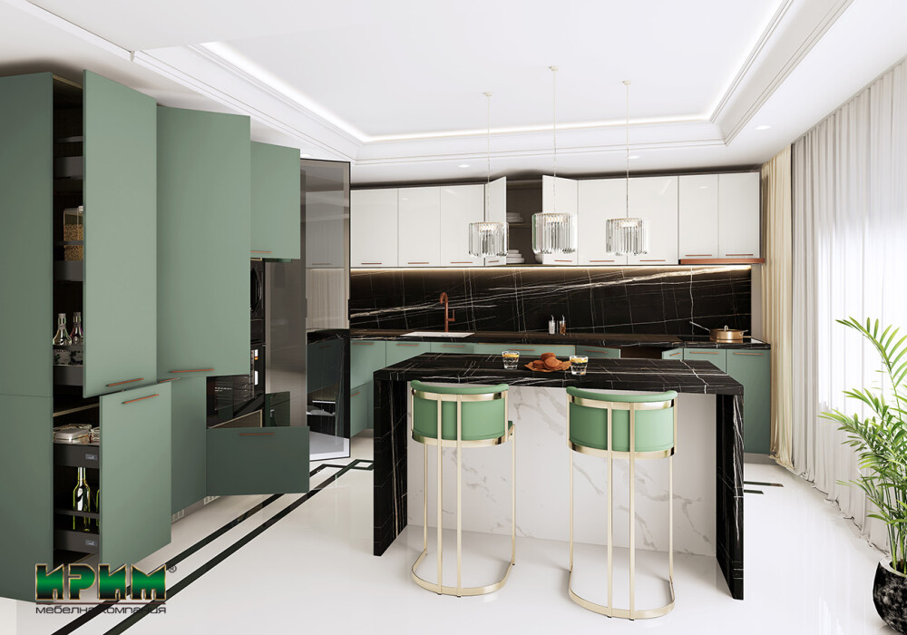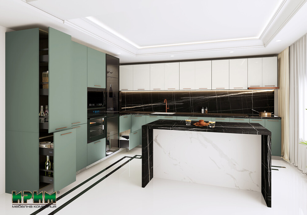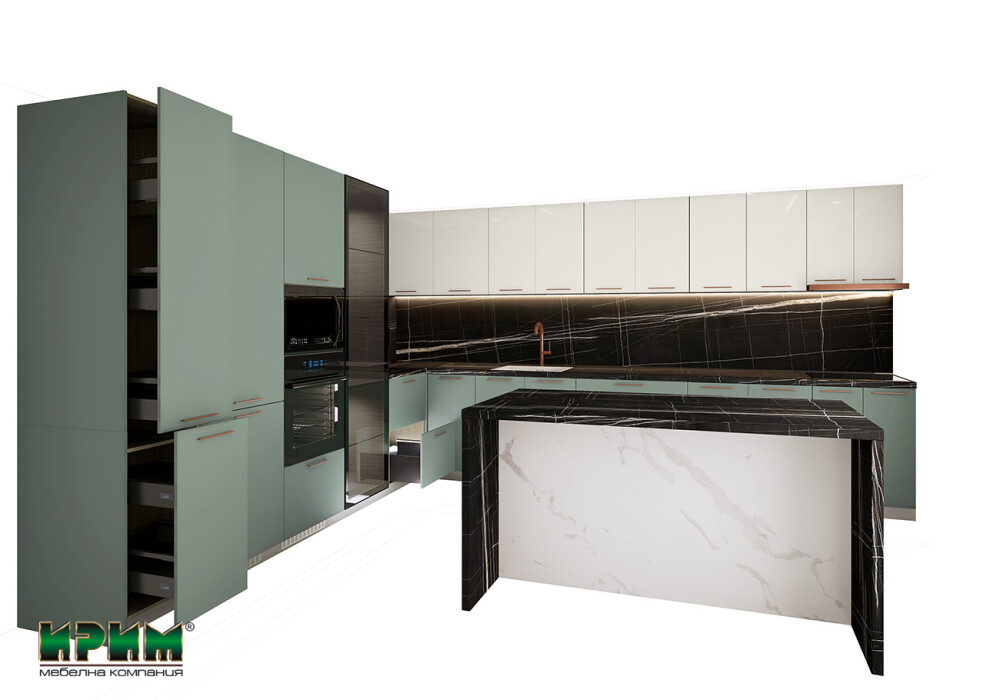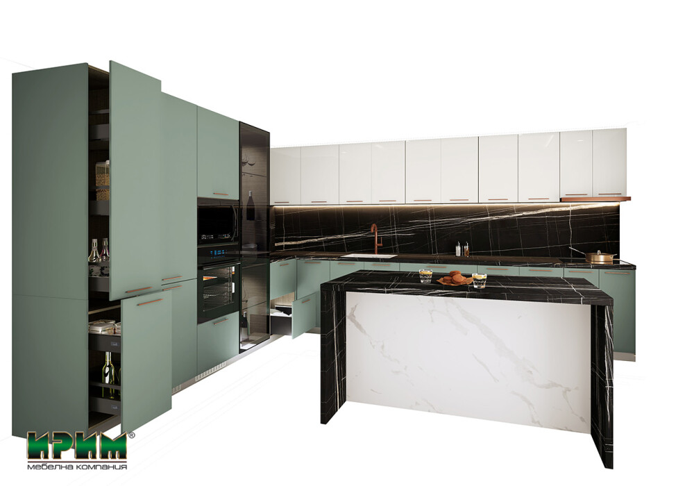 Луксозната кухня Сити 9192 впечатлява с модерен дизайн, висококачествени МДФ материали и стилна цветова комбинация. Функционалните модули, системите за плавно прибиране InnoTech Atira, витринният шкаф с LED осветление и практичният остров осигуряват максимален комфорт и оптимално разпределение. С възможност за вграждане на мивка, уреди и хладилник, това кухненско решение е идеално за стилен и добре организиран дом.