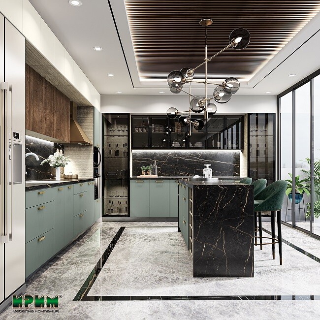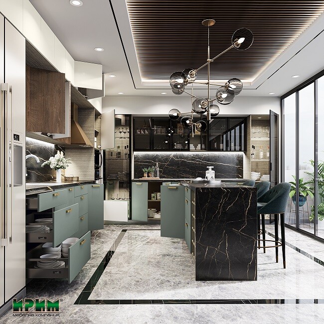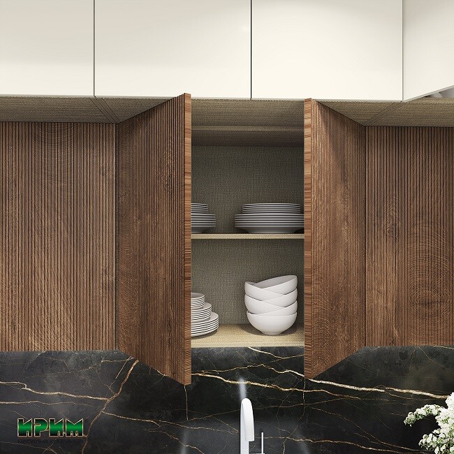 Луксозната кухня в Сити 9171 впечатлява с модерен дизайн, висококачествени материали и перфектно функционално разпределение. Долните модули са оборудвани със система InnoTech Atira за плавно прибиране, а витринните шкафове с LED осветление добавят елегантен акцент. Кухнята предлага множество възможности за вграждане на уреди и мивка, както и удобен остров с чекмеджета и бутилиери. Идеален избор за просторни и стилни интериори, съчетаващи уют и практичност.
