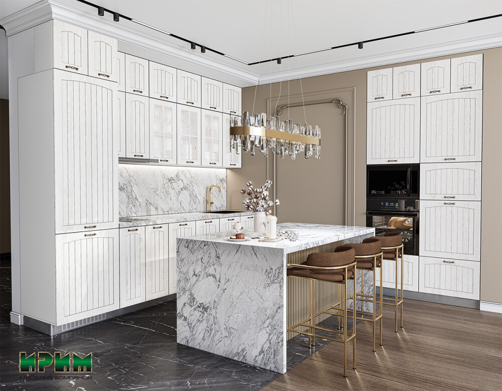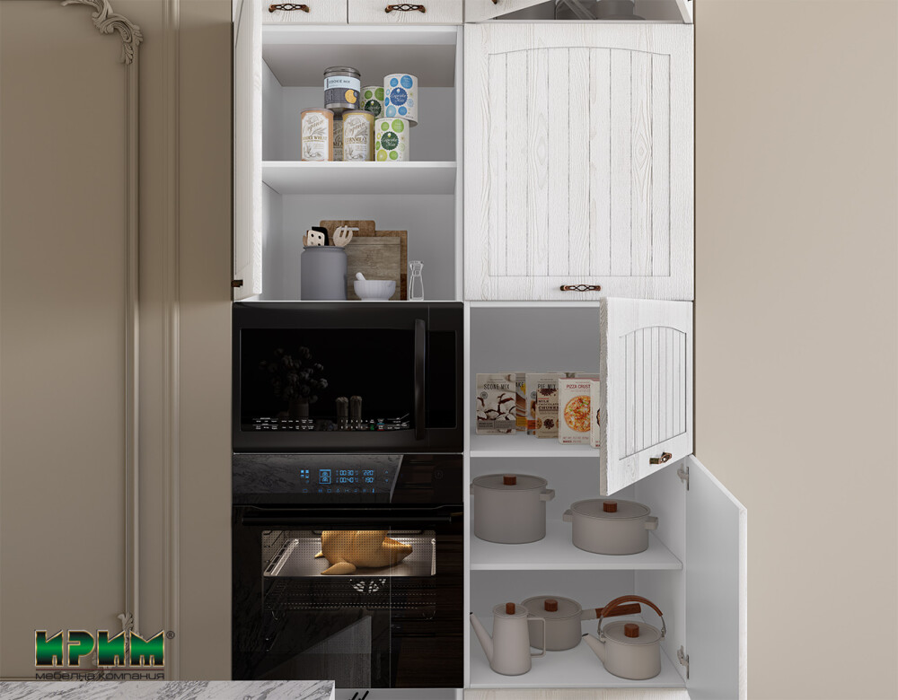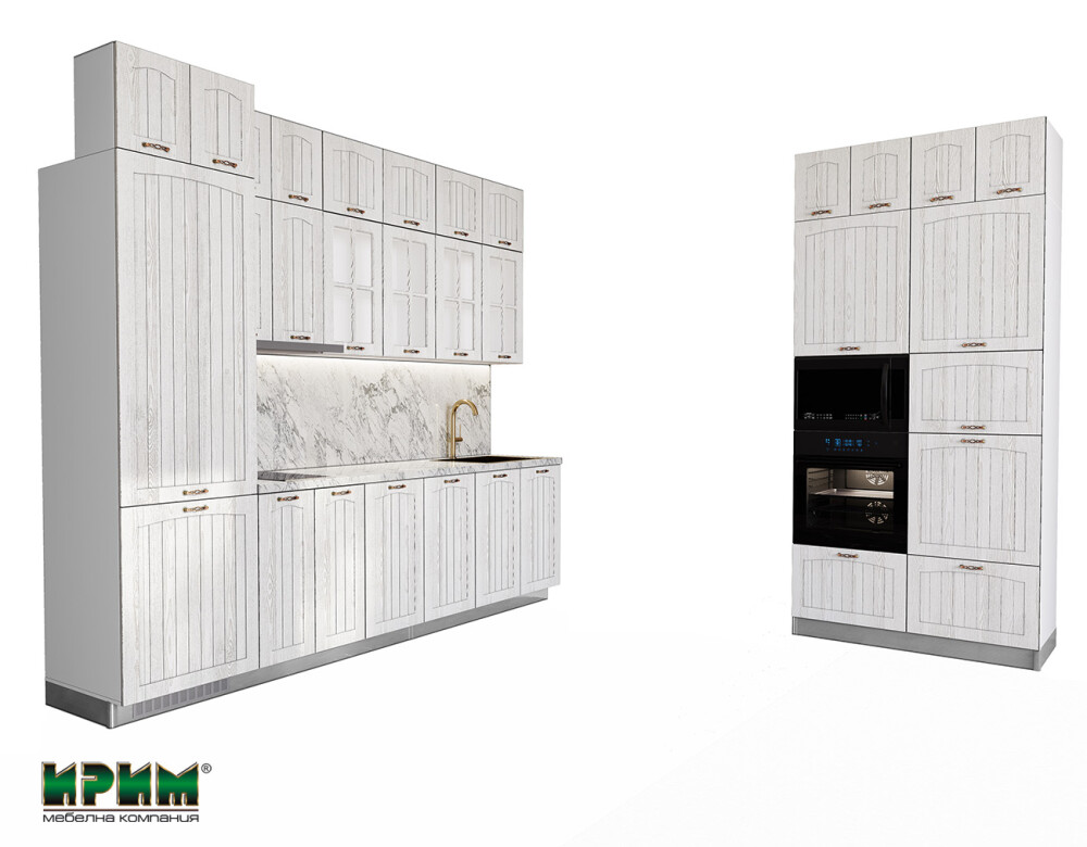 Кухнята Сити 9132 впечатлява с модерен и изтънчен дизайн, съчетавайки светли тонове и висококачествени материали за стилна и функционална визия. Конфигурацията включва колонни модули за вграждане на хладилник, фурна и микровълнова, както и удобни шкафове с възможност за вграждане на мивка. Горното разпределение предлага комбинация от витринни и плътни врати, осигуряващи практично съхранение и елегантно излъчване. Плавното затваряне и качествената МДФ изработка гарантират дълготрайност, комфорт и висока надеждност в ежедневната употреба.