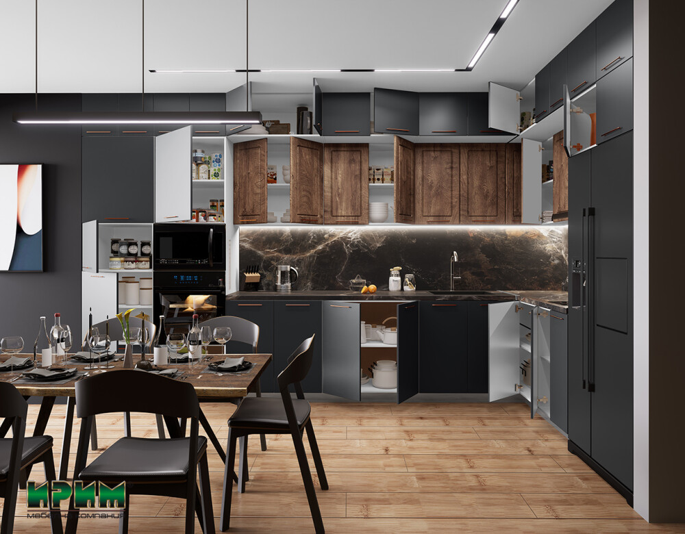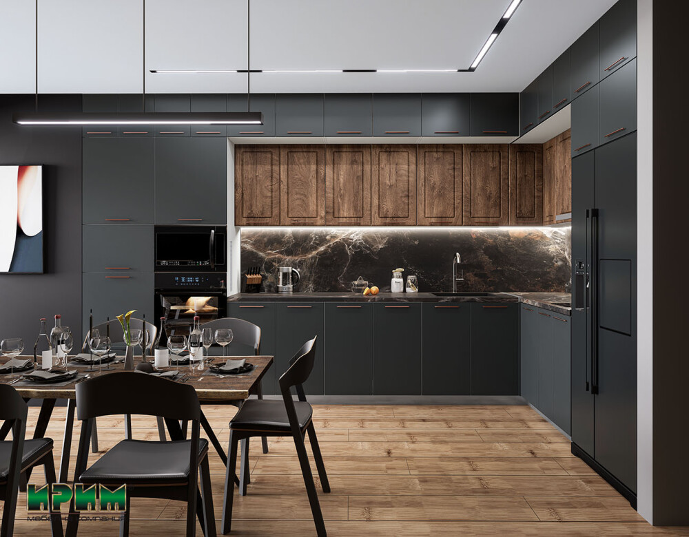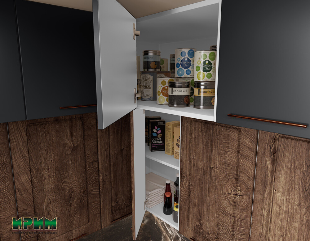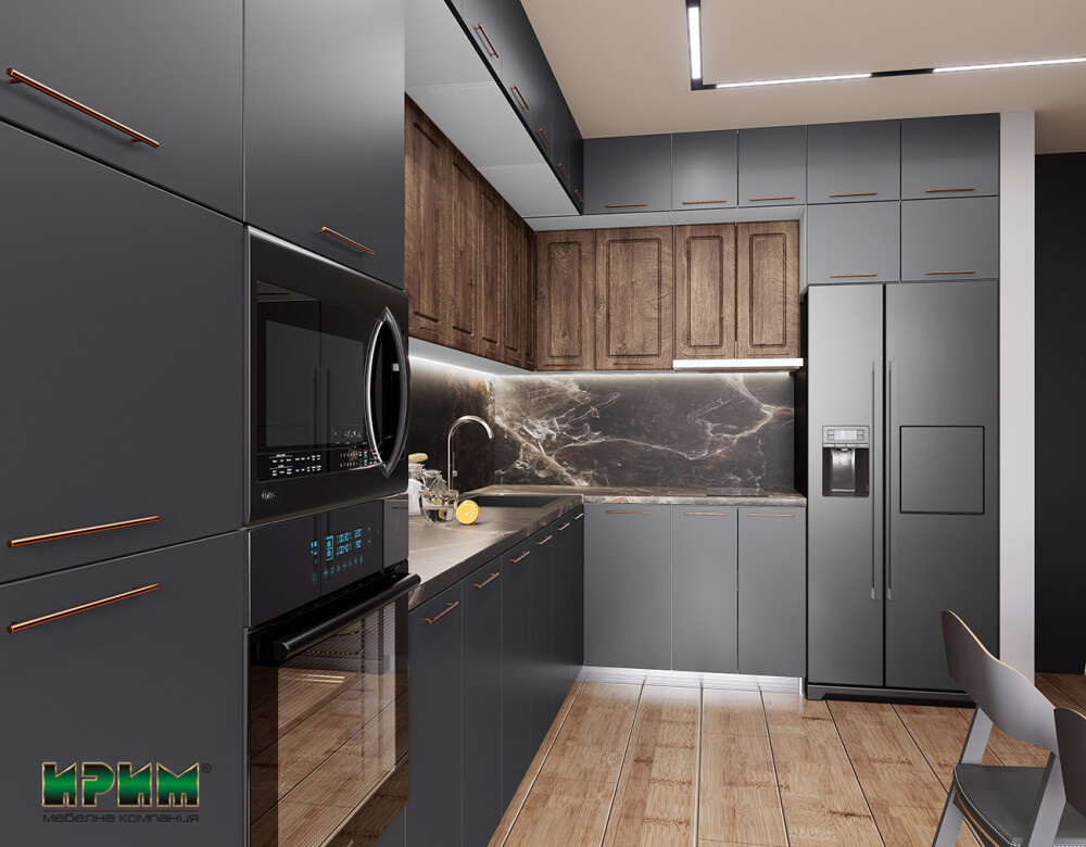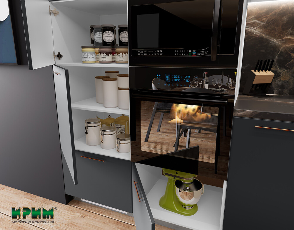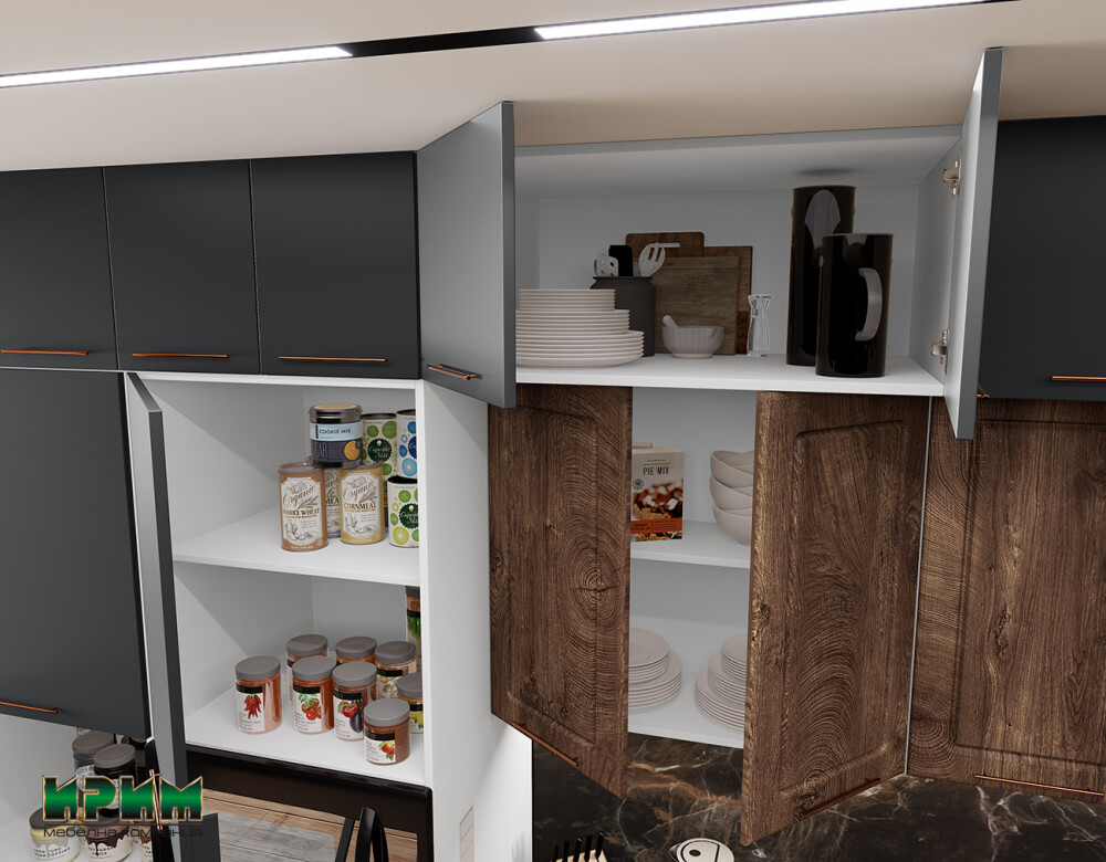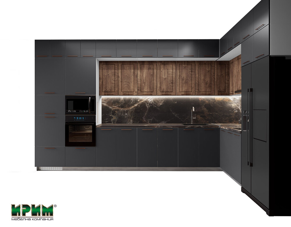 Кухнята Сити 9125 впечатлява с елегантна модерна визия, комбинираща тъмен матов ефект и естествен дървесен акцент. Функционалният долен ред включва колонни модули за фурна и микровълнова, широки модули за мивка и удобен ъглов шкаф, осигуряващи максимално използване на пространството. Горният ред предлага богато пространство за съхранение чрез множество шкафове, включително ъглови модули, витрини и модул за аспиратор. Изработена от висококачествен МДФ и оборудвана с плавно затваряне, кухнята гарантира стил, устойчивост и ежедневен комфорт.