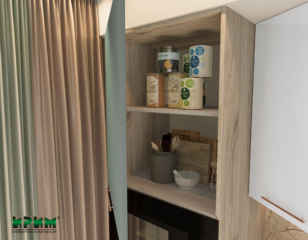 - Лице: МДФ Олив мат 18мм и МДФ Бяло гланц 18мм