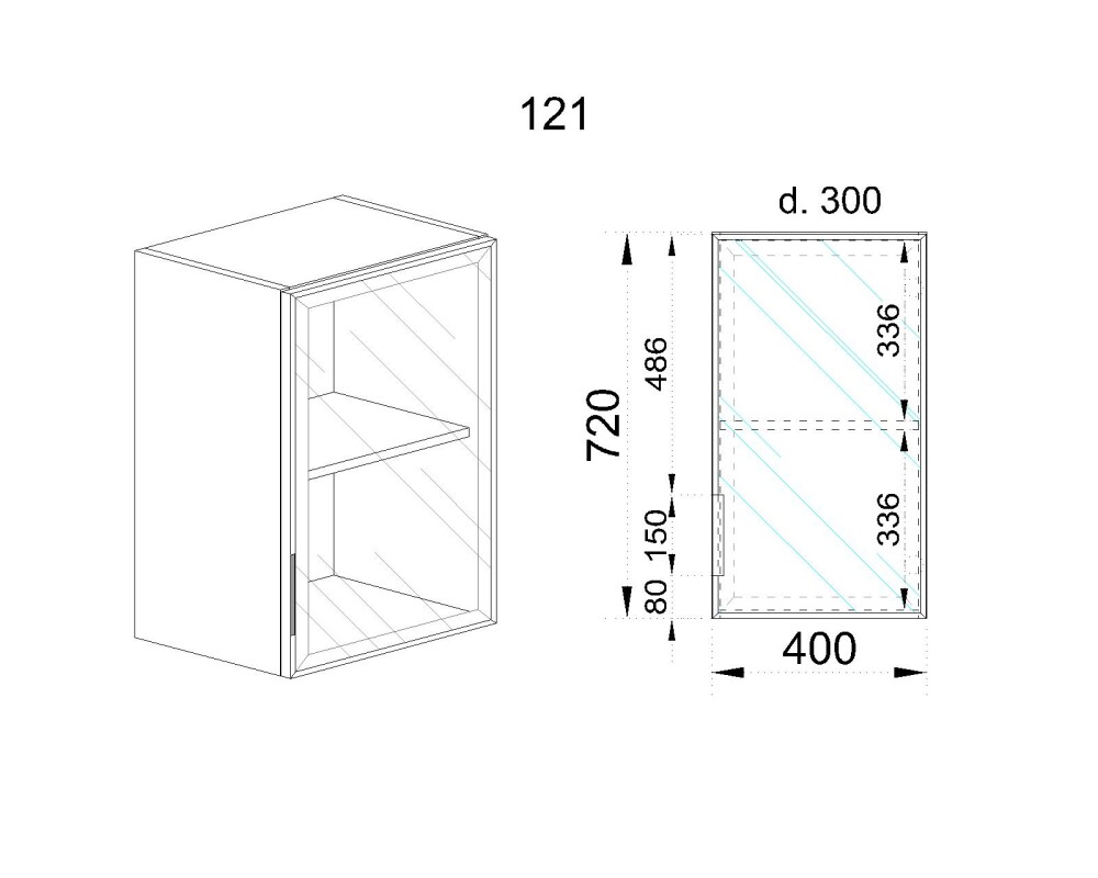 Горен модул със стъклена врата Алу глас и рафт МАЛ - 121 (десен)