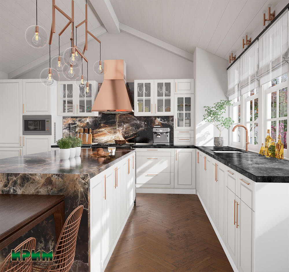 Кухня БФ-Бяло мат-09 съчетава модерен стил и класическа елегантност в изискана комбинация от бяло матово МДФ лице и плот „Камък антрацит“ . Медните акценти и изисканото осветление подчертават луксозното излъчване и вниманието към детайла . Просторният остров и функционалните модули осигуряват удобство, ергономия и възможност за вграждане на уреди . Идеалният избор за тези, които търсят съвършен баланс между стил и практичност .