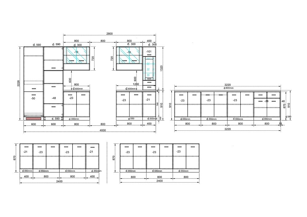 Дълбочина на шкафове под плот 55см.