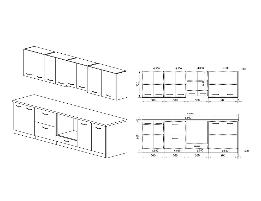 Дълбочина на шкафове под плот 55см.