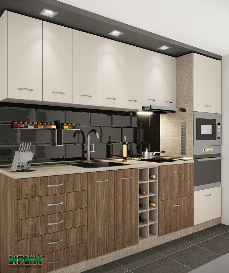 Модулната кухня Сити 9156 впечатлява с модерна визия, стилна цветова комбинация и функционално разпределение, подходящи за просторни кухненски пространства. Изработена от висококачествено ПДЧ 16 мм с корпус в цвят Мока и лица в декор Сатен и Орех Адмирал, тя съчетава елегантност, естествен дървесен ефект и устойчивост при ежедневна употреба. Кухнята включва разнообразни модули с плавно затваряне и възможност за вграждане на хладилник, фурна, микровълнова и мивка, което осигурява максимално удобство и ефективна организация. Термоплотът в декор Дъб класик допълва модерното излъчване и придава завършен стилен вид. Отличен избор за създаване на функционална, просторна и стилна кухненска среда.