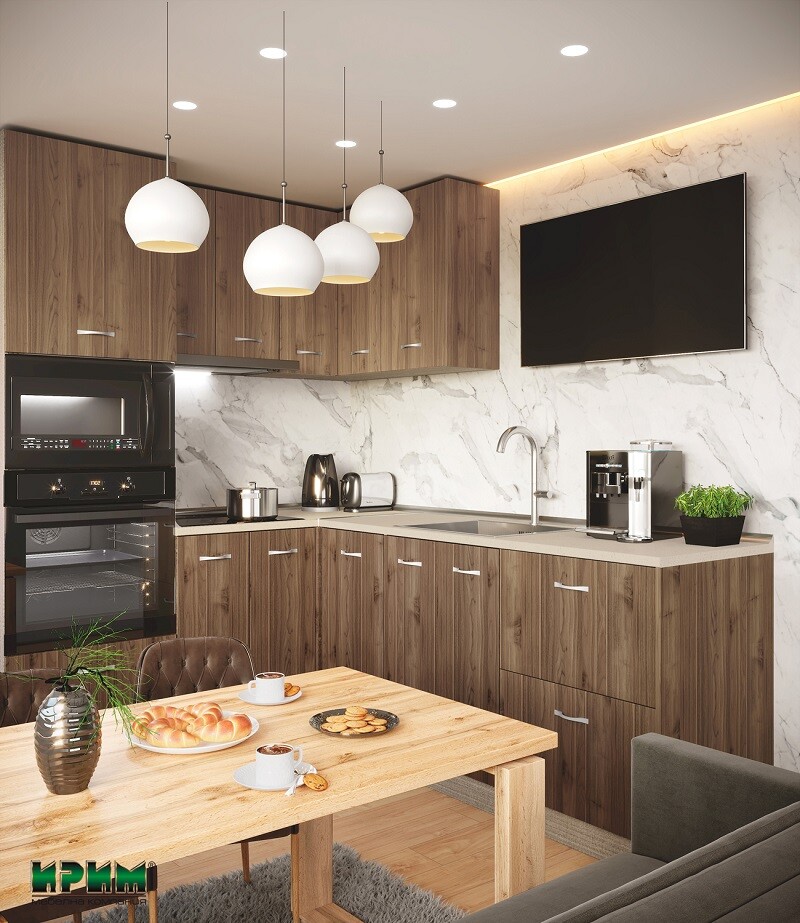 Модулната кухня Сити 9157 впечатлява с модерна визия, естествен дървесен ефект и практично функционално разпределение. Изработена от висококачествено ПДЧ 16 мм с лице в цвят Орех Адмирал и корпус Мока, тя съчетава стилен дизайн, здравина и устойчивост при ежедневна употреба. Комплектът включва разнообразни долни и горни модули с плавно затваряне, възможност за вграждане на мивка, фурна, микровълнова и аспиратор, както и удобен ъглов шкаф за оптимално използване на пространството. Термоплотът в декор Алания допълва модерното излъчване и придава завършен елегантен вид. Отличен избор за създаване на функционална, удобна и уютна кухненска среда.